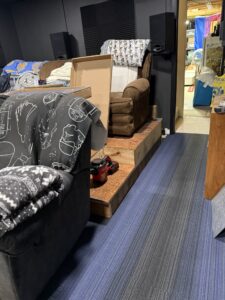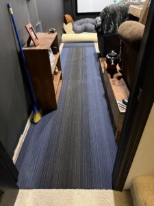 I’ve acquired a few boxes of commercial carpet tiles, so I decided to put them in the theater.