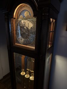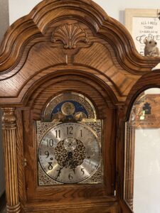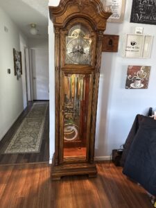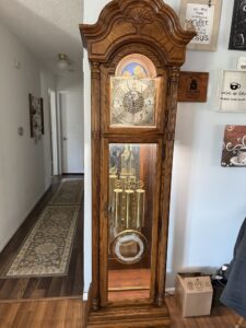 We found a grandfather clock for sale online. The person selling it was very accommodating and was willing to hang onto it until we arranged transportation for it. We finally got it moved on March 28th. It had a brass moon dial and an Incandescent light inside to light the bottom pendulum and weights.